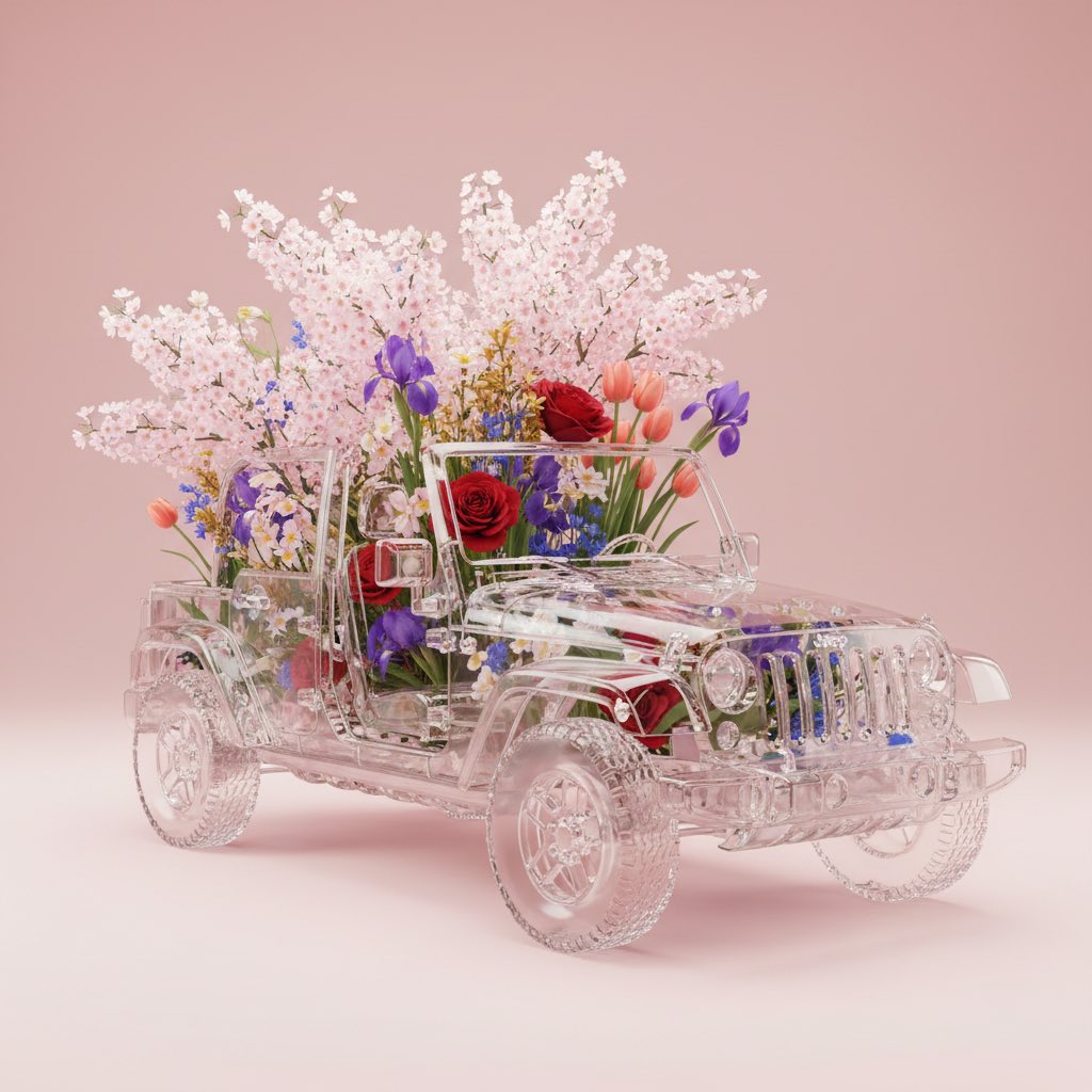 Hyper-realistic 3D render of flowers in a transparent object