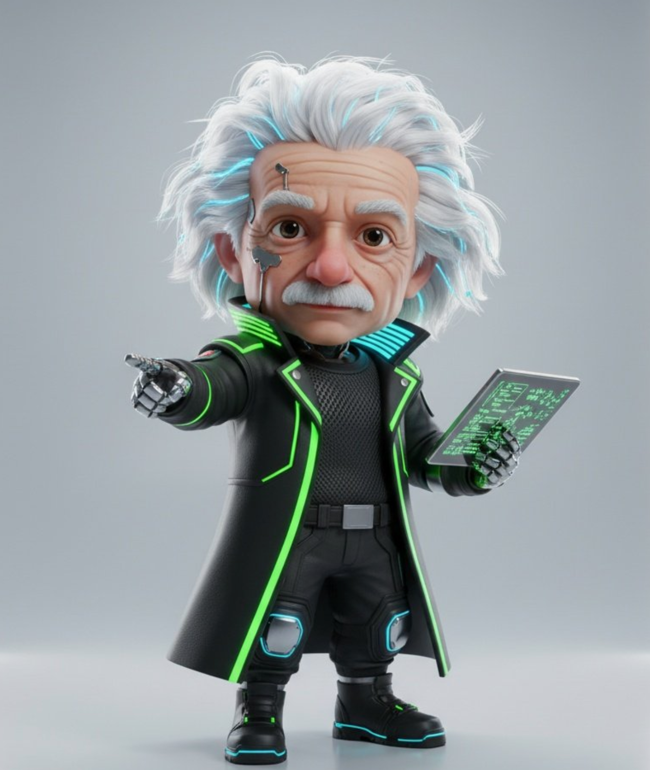Prompt:3D tiny cyberpunk [Celeb Name] with subtle cybernetics and neon accents, full body in dynamic pose, clean minimalist background, cinematic soft
