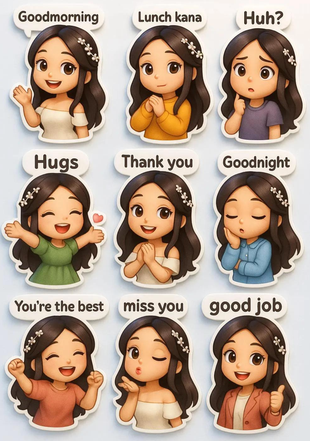 Prompt:Create a 3D kawaii 10:16 canvas featuring nine chibi-style stickers in various outfits, poses, and expressions. Use the attached image for refe