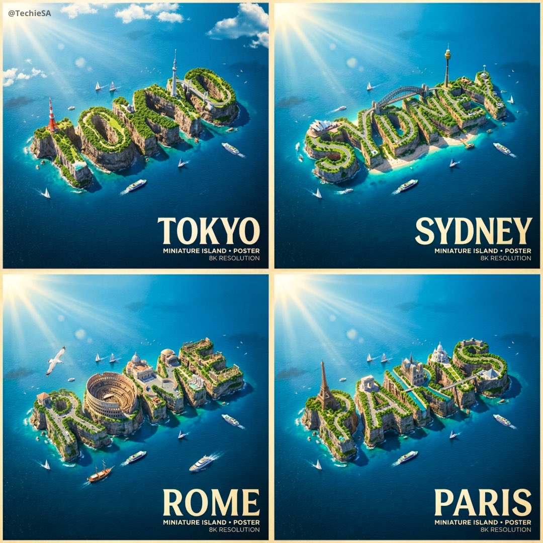Create an ultra-HD, hyper-realistic 1:1 poster of a “CITY” in miniature island with “CITY”, featuring iconic landmarks. The 3D letters “CITY” should