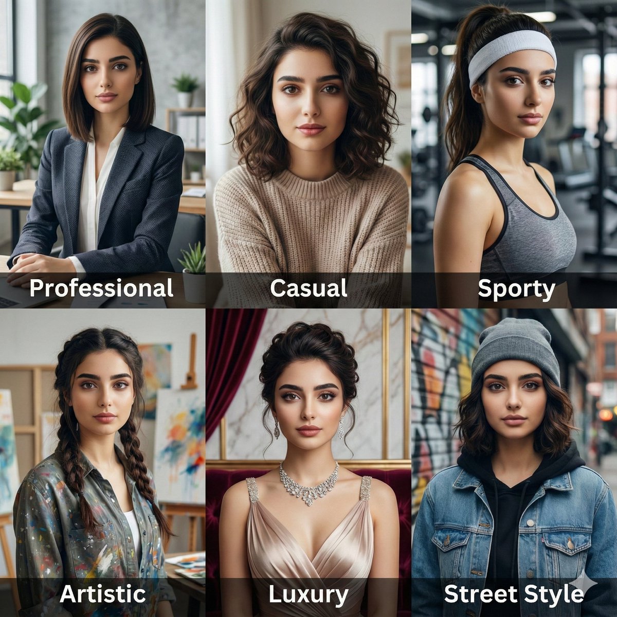 Create a high-quality 6-panel portrait collage using the uploaded photo as the same person in every panel. Each panel shows a different mood and style