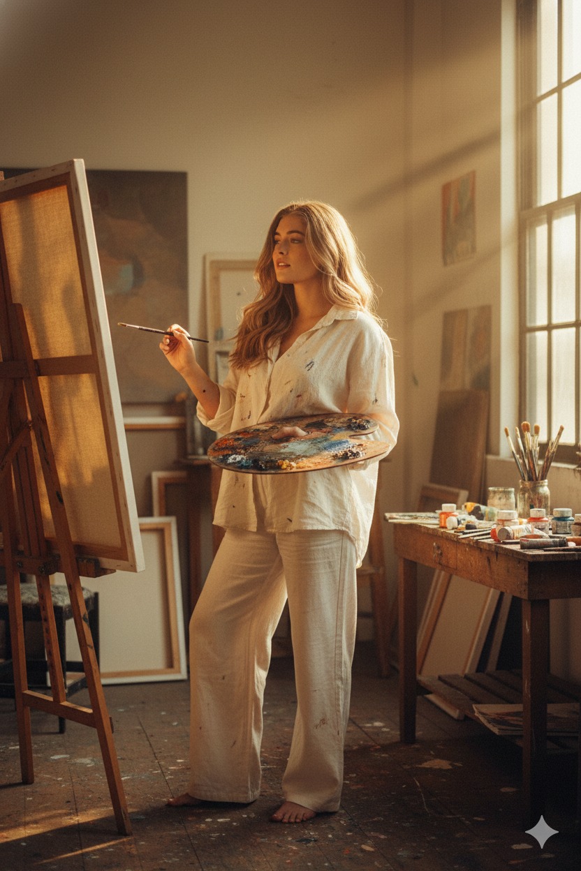 A cinematic aesthetic full-body portrait of a young Indonesian woman with long wavy caramel brown hair, standing in her vibrant art studio as a painte