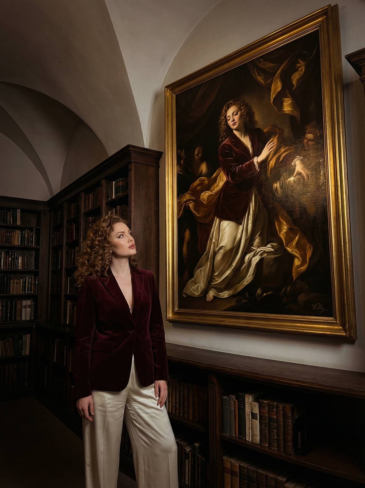 A mesmerizing library interior featuring a stunning European woman standing before a massive baroque painting of herself, meticulously recreated on th