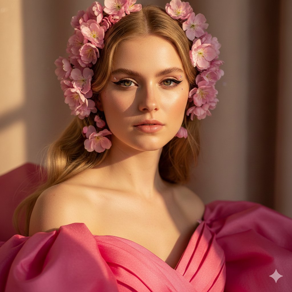 Cinematic Pink Blossom Couture Portrait of a Young Woman