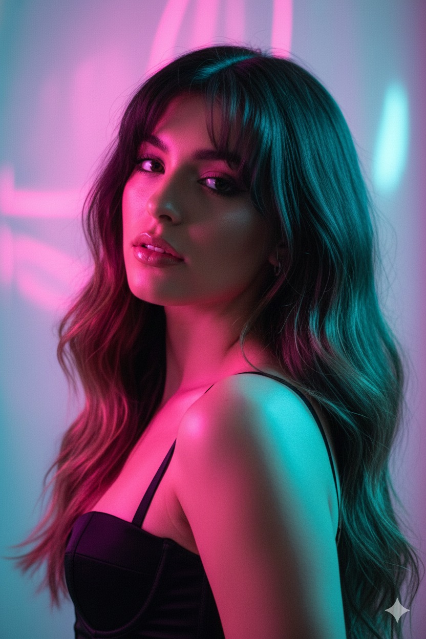 womanportraityoungfashioneditorialstudiosubjectfacephotographyhairshotcloseblacklongreferencesoftlightingfulllightpinkwearingfeaturesbrownwavycameraneonfuturisticcyberpunkbased