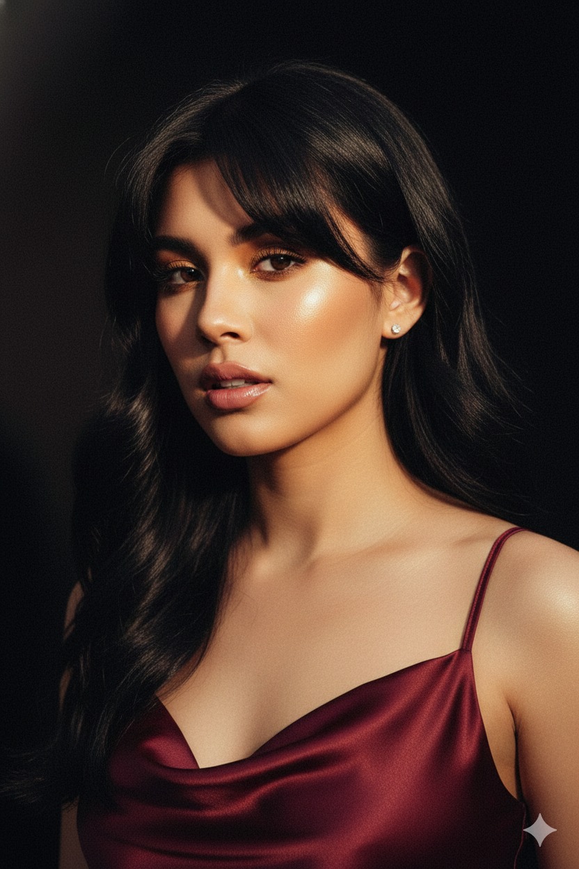 womanportraityoungphotorealisticcinematiceditorialsubjectfacephotographyhaircloseblacklongreferencegoldensoftlightingdarklighthourpinkwearingfeaturesbrownwavycleangoldbasedtiny