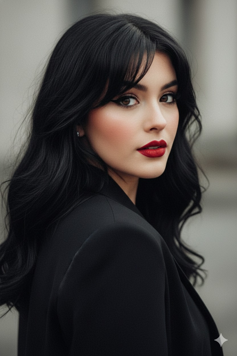womanportraityoungphotorealisticcinematicstudioclosephotographblacklongreferencesoftbeautifullightingdarkfulllightfeaturingwearingbrownwavycameranaturalbased