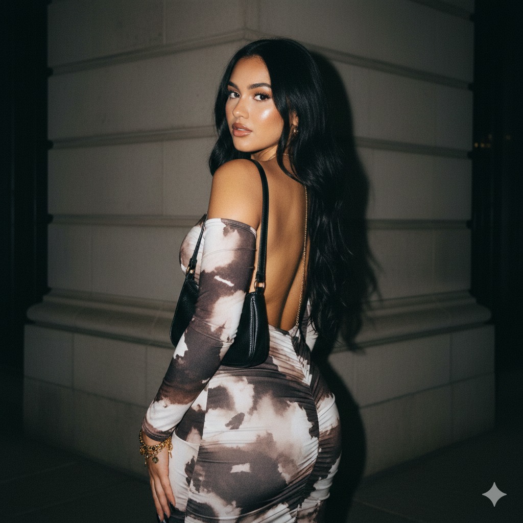 Create a dreamy y2k portrait of me with very long, deep black hair falling freely over my back with loose waves. I pose with my back slightly turned t