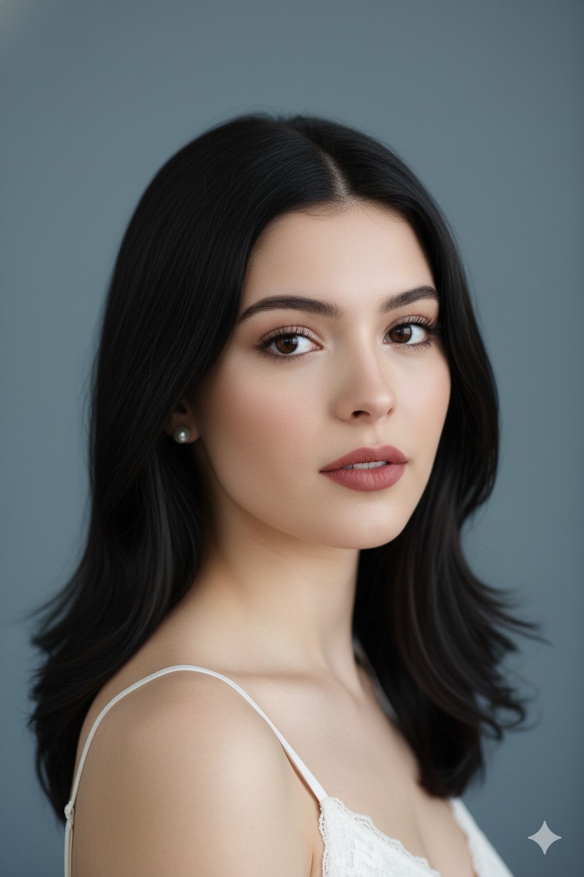Use the attached reference photo for the model's face and...Create a captivating close-up, studio portrait of a young...