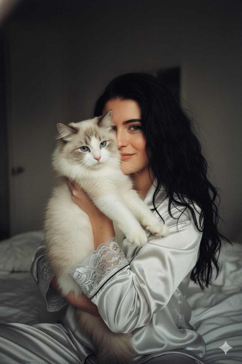 Create a raw selfie-style portrait of a young woman use uploaded photo as face and hair reference, with her ragdoll cat covering slight her face, only