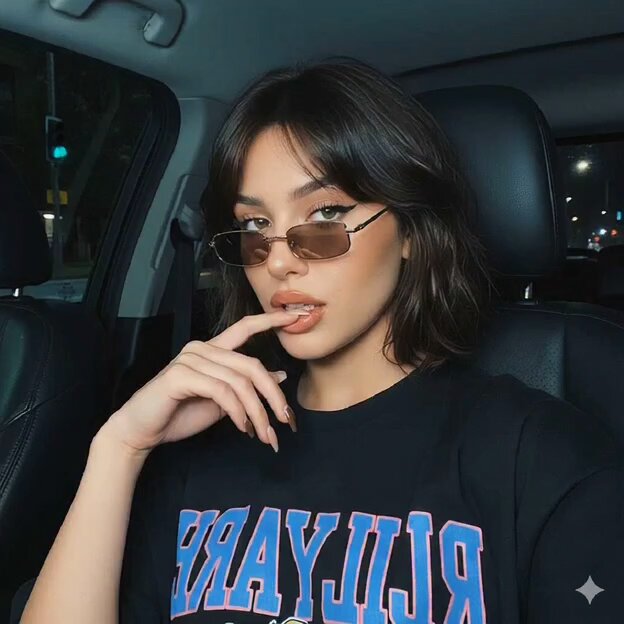 Edgy young woman selfie in car at night, 90s sunglassesYoung woman portrait in bedroom with soft lighting