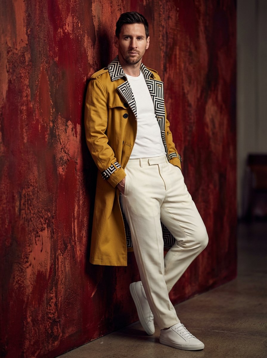 1. A Fashion editorial portrait of a stylish man messi face leaning against a textured abstract red backdrop, wearing a mustard yellow trench coat wit