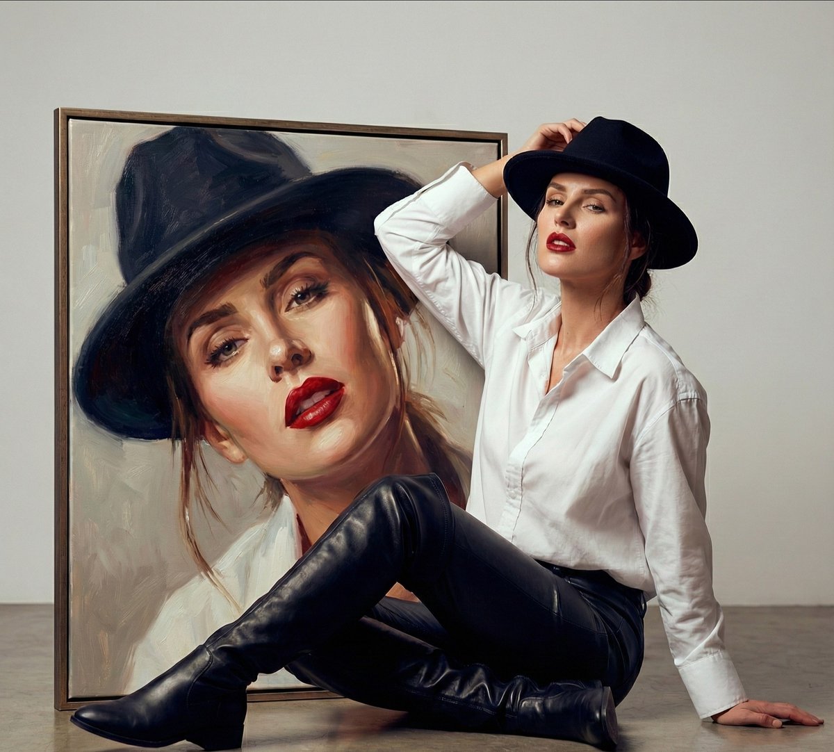 A fashionable woman sitting on the floor beside a large framed oil painting of herself, blending fine art portraiture with modern fashion photography.