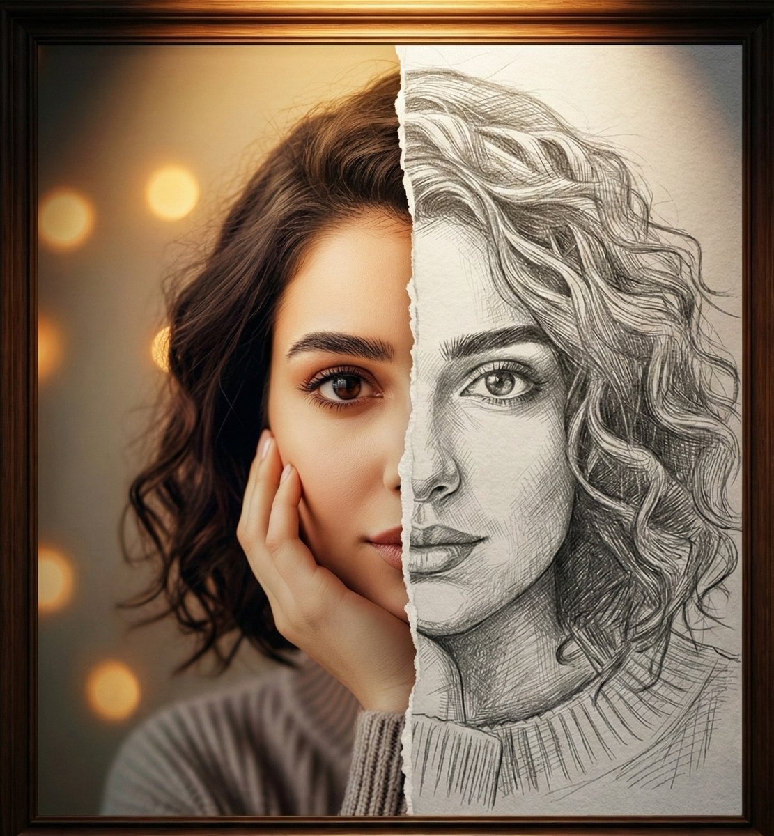 Framed Portrait: Color Photo & Pencil Sketch of a Woman