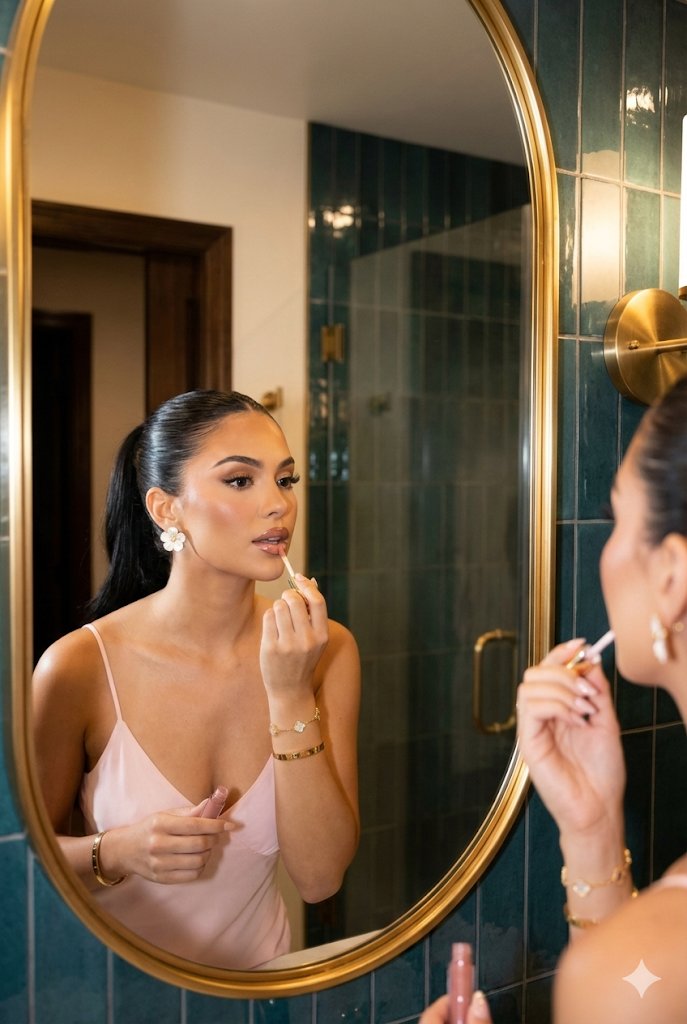 Glamorous Woman Applying Lip Gloss in Mirror ReflectionUltra-Realistic Mirror Selfie in Elevator with iPhone