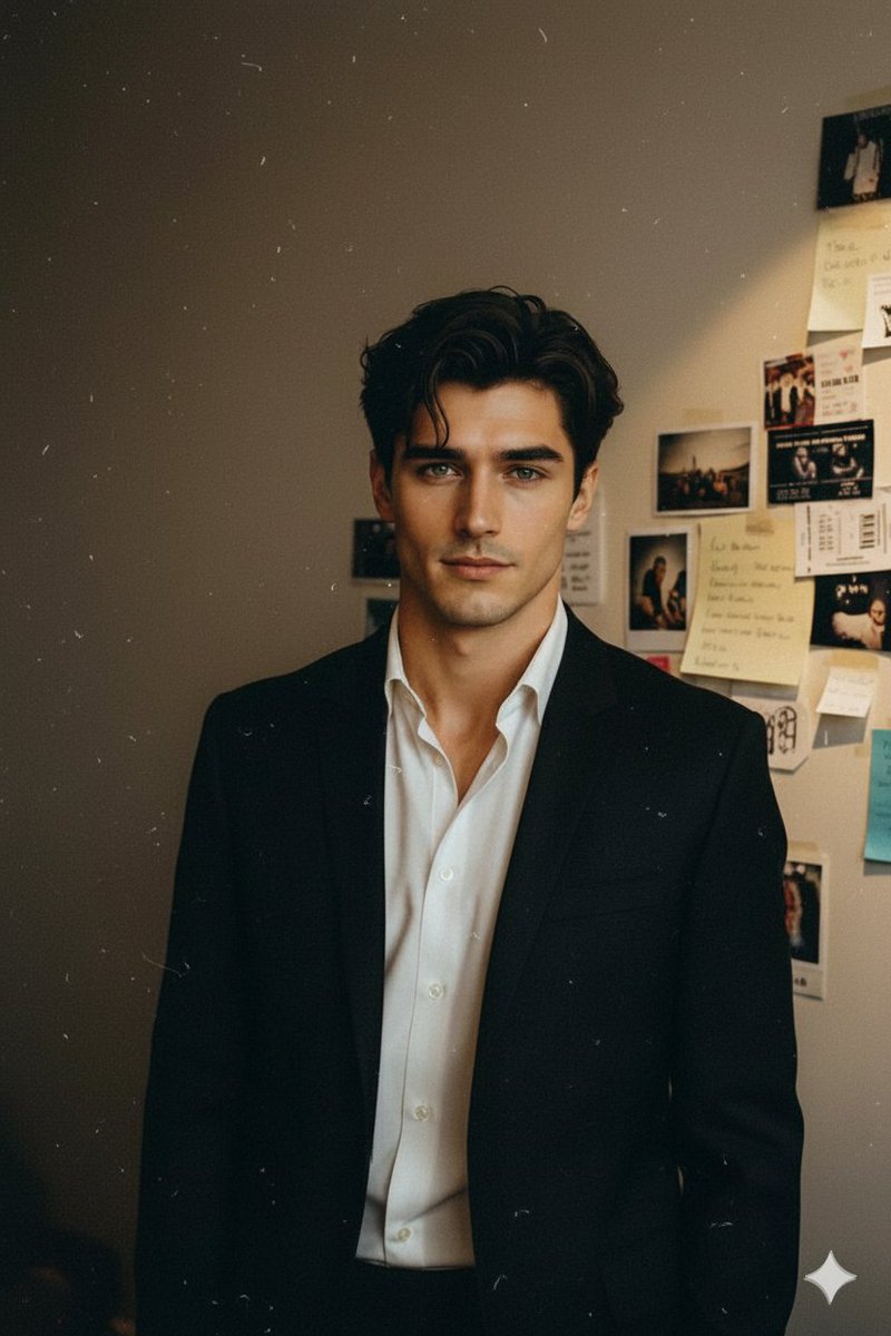 A cinematic, medium-shot portrait of a handsome young man with dark wavy hair, chiseled features, and intense green eyes. He is wearing a tailored bla