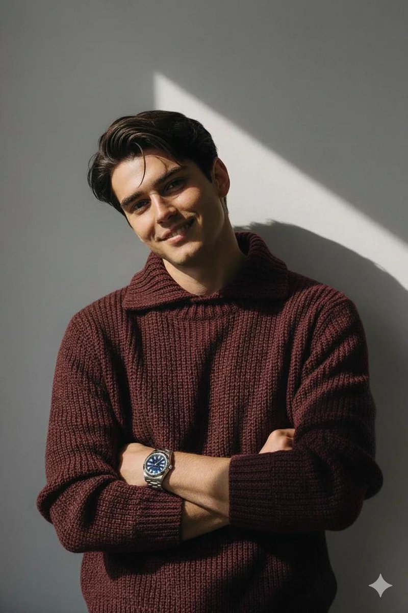 A handsome man smiling and posing with his arms crossed, wearing a maroon knitted high-collar sweater, with a high-end Rolex watch visible on his wris