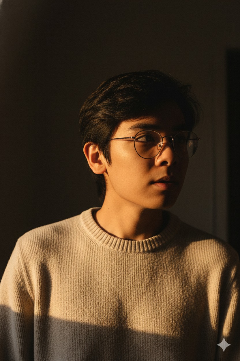 I am sitting indoors, captured in a cinematic close-up portrait. My upper body is slightly turned at an angle to the camera, while my head is rotated