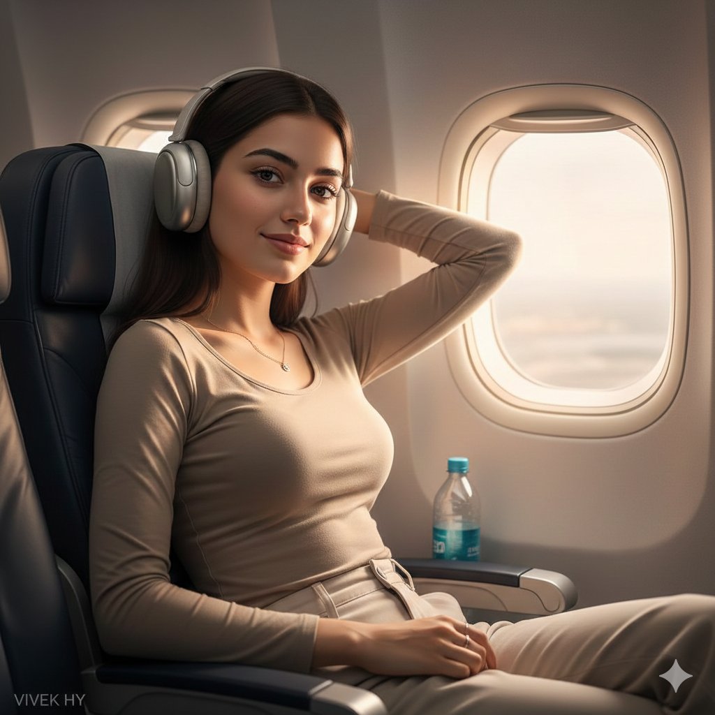 Intimate Travel Portrait of Young Woman in AirplaneYoung woman in cozy otaku bedroom with anime and cosplay vibe