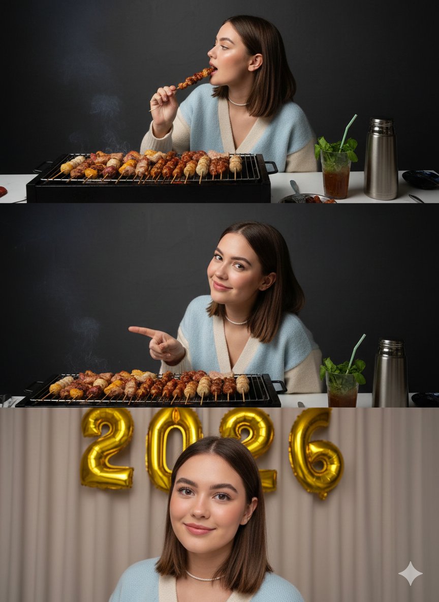 Photorealistic 3-photo collage of a woman celebrating 2026