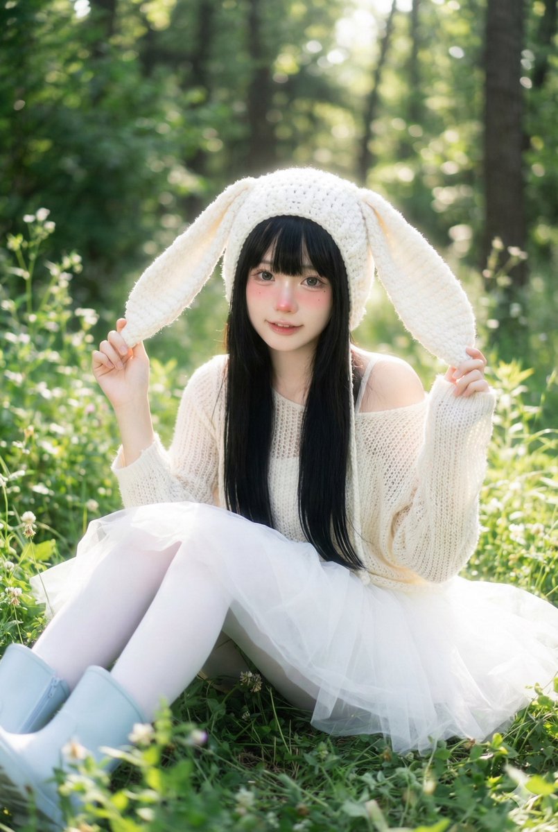 portraityoungphotorealisticfacephotographyfemalehairblackwhitelongsettingasiansoftlightingsittingaestheticlightoutdoorcartooncutenaturalforest