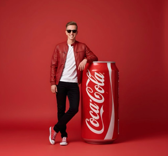 Prompt:"A full-body hyper-realistic studio portrait of a man from attached photo [red bomber jacket, white t-shirt, black jeans, red sneakers ] in a [