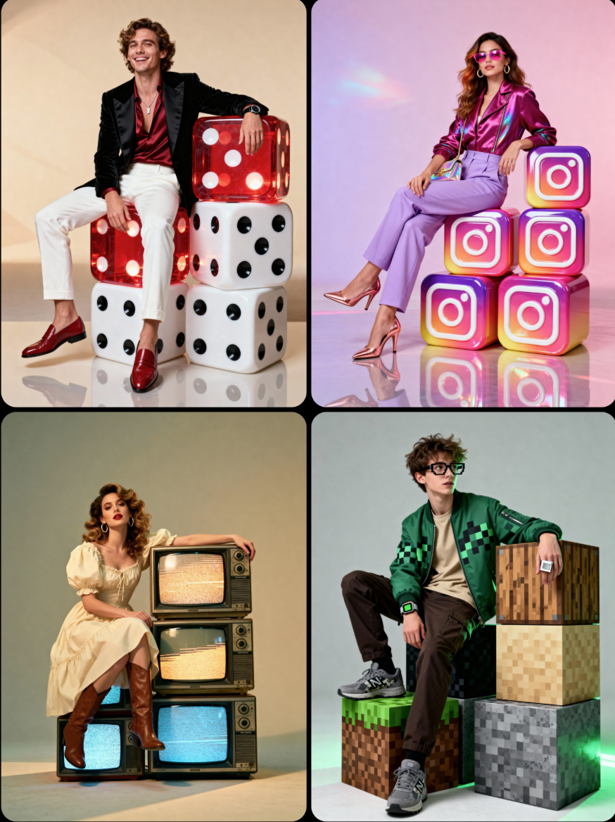 Prompt:A hyper-realistic full-body studio portrait of [CHARACTER_DESCRIPTION]. The character is seated on a setup made of five large cubic objects of