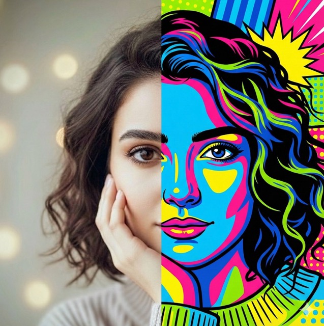 Prompt:A split-face dual-style portrait using the uploaded photo. The left half shows a soft, realistic studio photograph with natural skin tones, sha