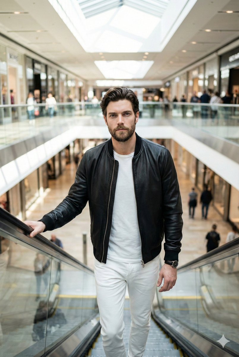 "prompt": "A vertical, high-quality urban lifestyle portrait of a young man with styled hair and a beard, wearing a black leather bomberRelated Prompts