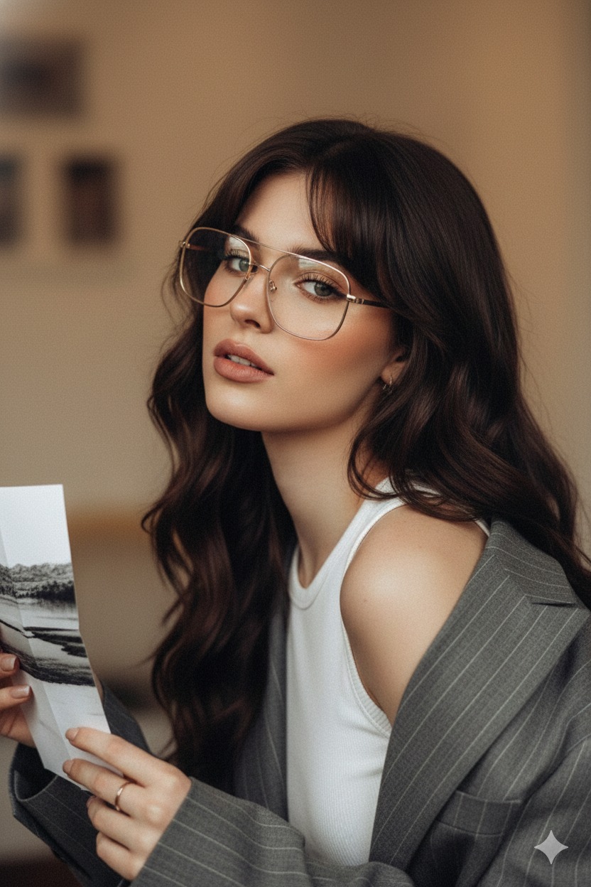 womanportraityoungeditorialfacehaircloseblackwhitelongsoftlightingusingdarkaestheticlightmodelpinkwearingbrowncameracandidnaturalagainstoutfitgoldpaper
