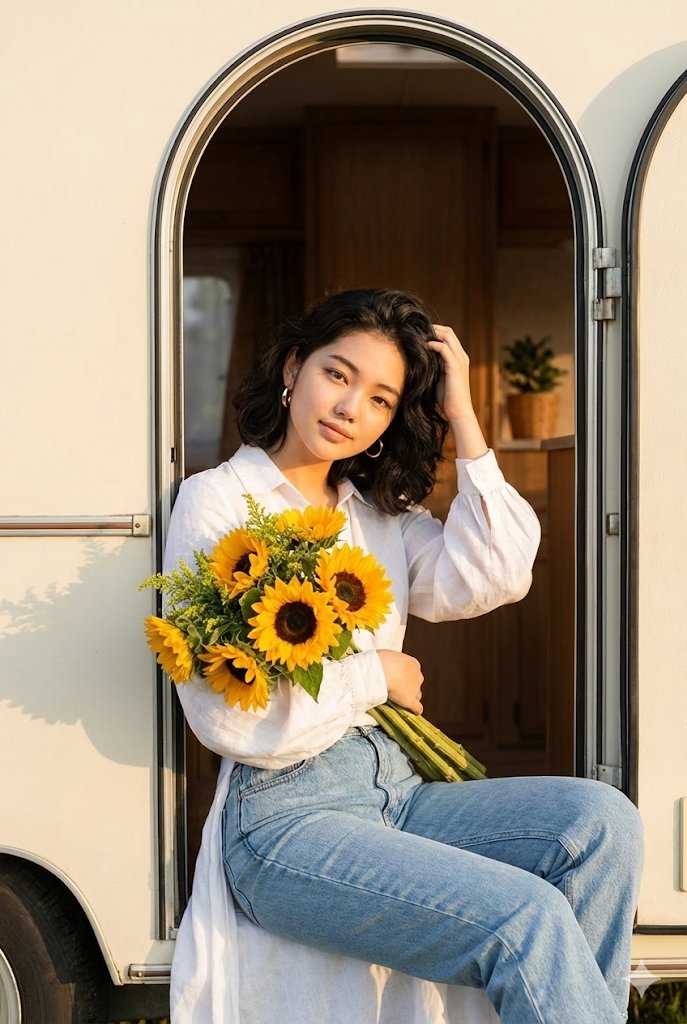 Photorealistic portrait of a young woman in a bedroomVintage Camper Lifestyle Portrait with Sunflowers, Golden Hour
