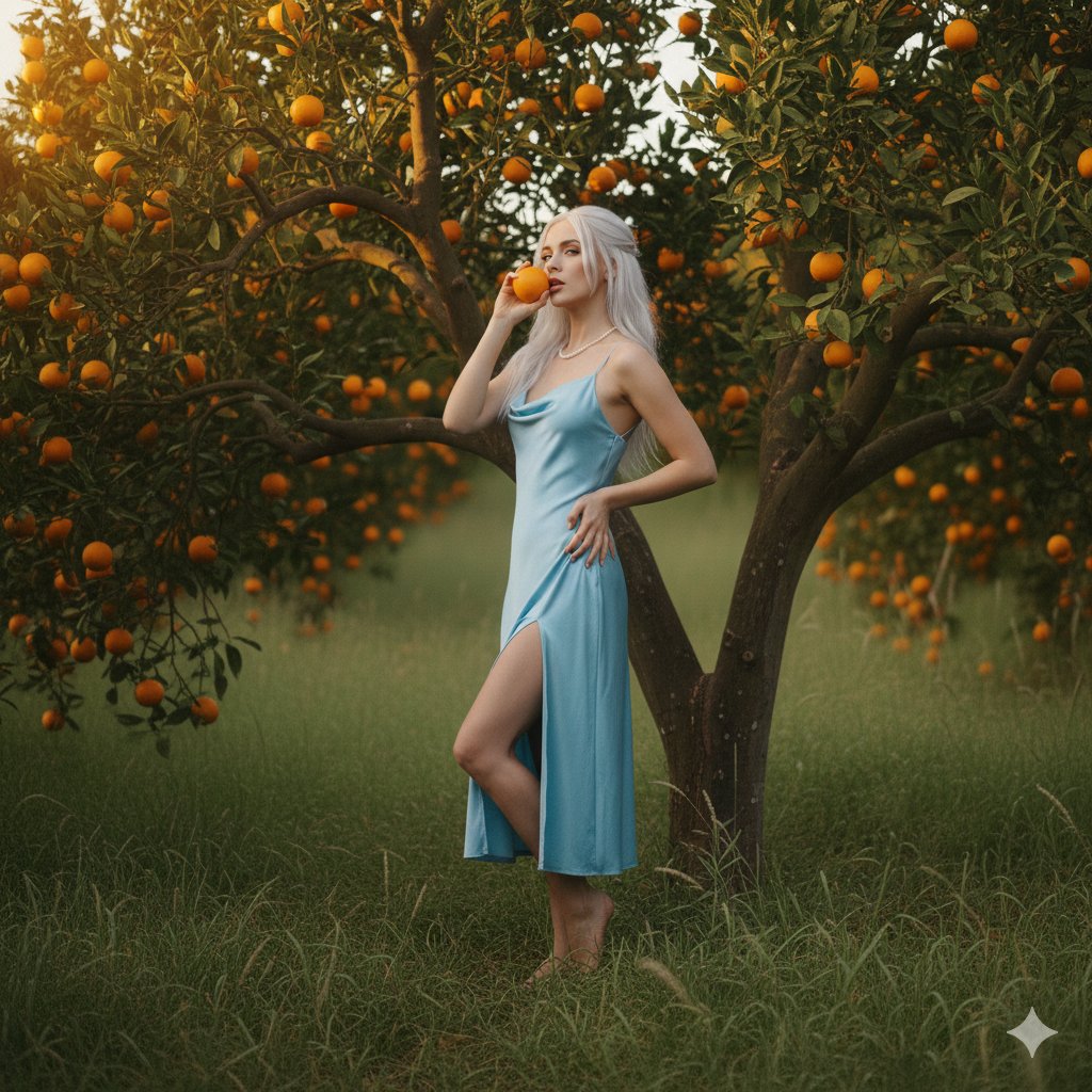 Woman in Orange Grove at Golden Hour - Editorial PhotoPhotorealistic Portrait of Woman with Snake, 8K UHD