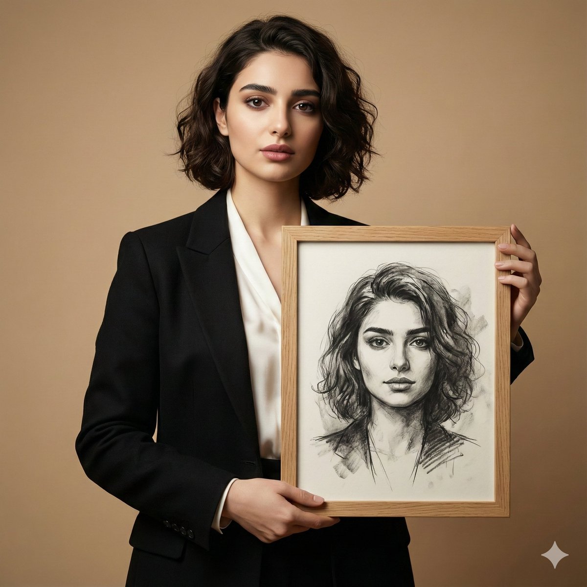 A stylish woman in a tailored blazer stands against a soft neutral studio backdrop, holding a wooden frame. Inside the frame is a charcoal illustratio