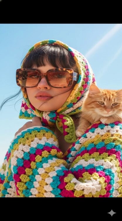 Young Woman in Crochet with Cat, Editorial Fashion Portrait