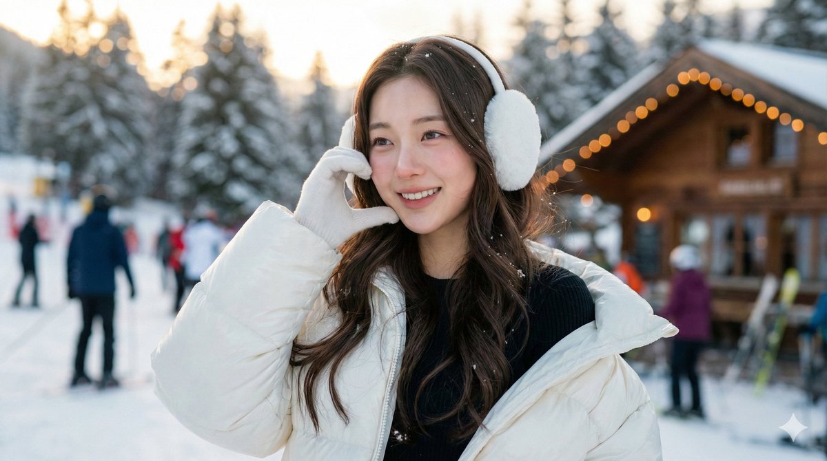 Youthful Korean K-Pop Idol in Winter Snow-Bunny Style