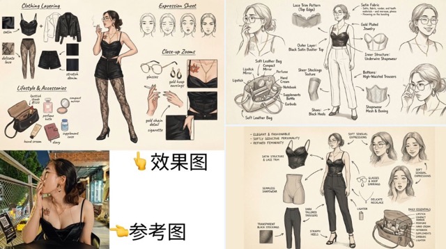 Prompt:A fashion-style concept breakdown sheet in hand-drawn illustration style. Center: full-body view of a stylish, confident female character with
