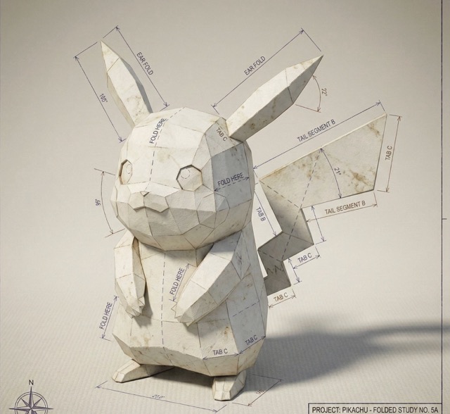 Prompt:A hyper-detailed folded-paper blueprint of [character], where the character is constructed from precise geometric folds and crease lines, overl