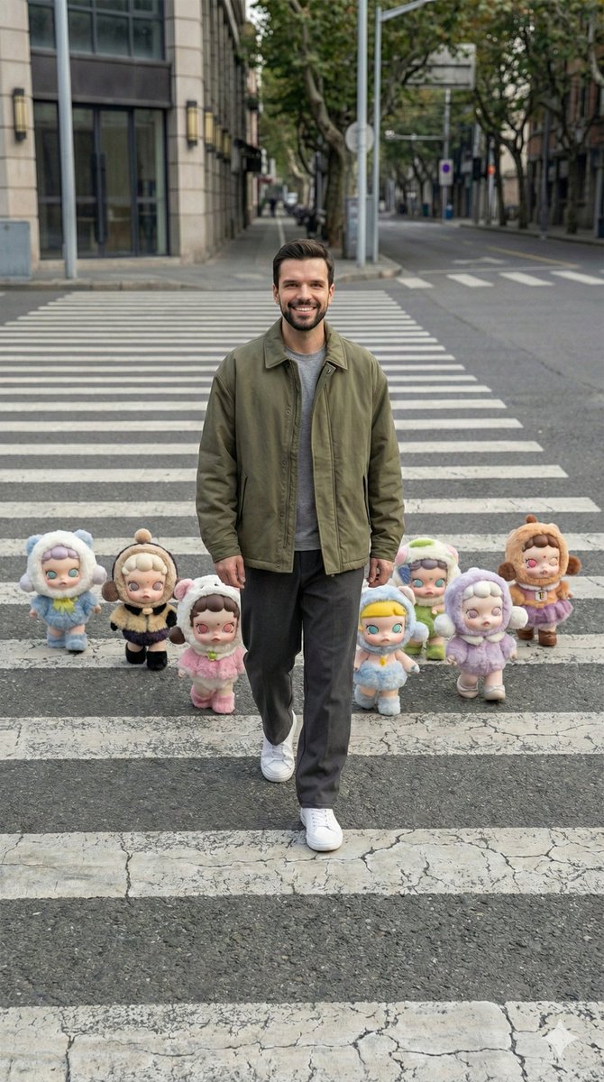 Young Man Walking with Skullpanda Figures on Street