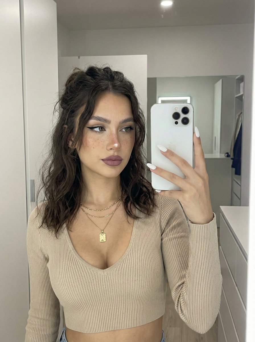 womanyoungphotorealisticselfiemirrorsubjectfacephotographyintonanomodernbananabedroomhairblackwhitelongsettingsoftminimalistlightingdarkbodyaestheticlighthighlyconfidentdigitalinteriorbrowninfluencercamerasmartphonestandingnaturalleaningindoorcleangoldhand