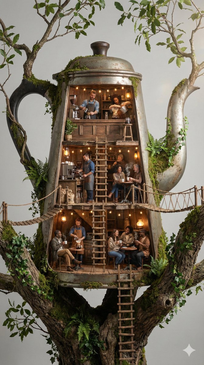 Peaky Blinders-inspired portrait in a smoky 1920s barGiant object fused with tree diorama, cinematic photo