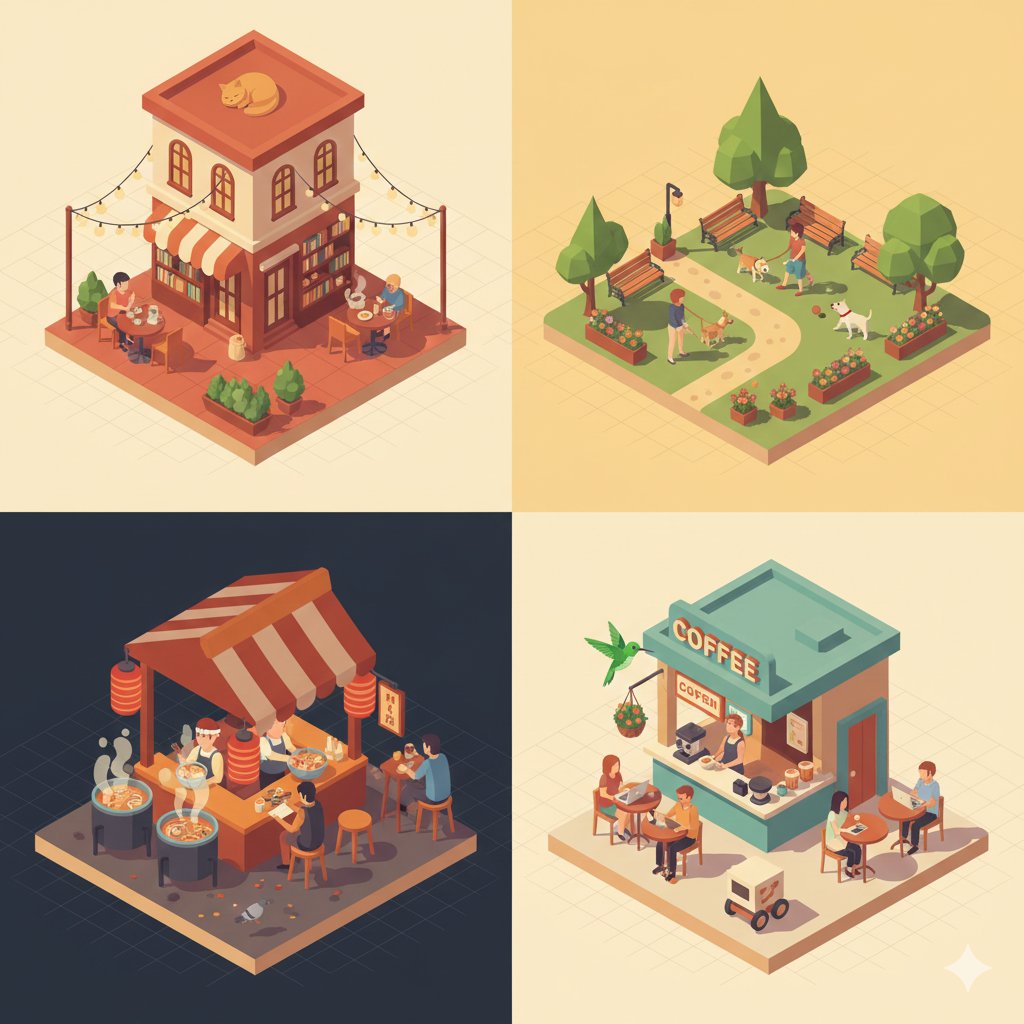 2.5D Isometric Micro-Scenes in a 2x2 Grid Illustration