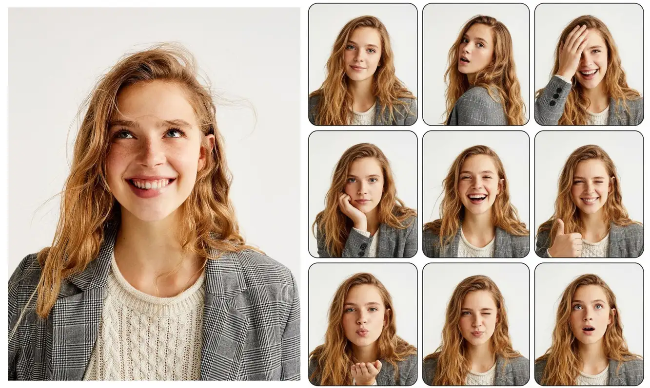 用这张照片,做一个3*3的photo booth grid,每张要用不同的姿势和表情不许重复