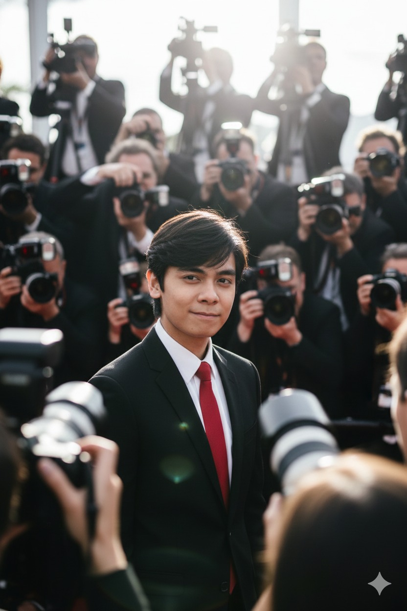 A candid photo of a man surrounded by paparazzi, using the provided image as a face reference - the same features, the same eyes, the same hair, the s