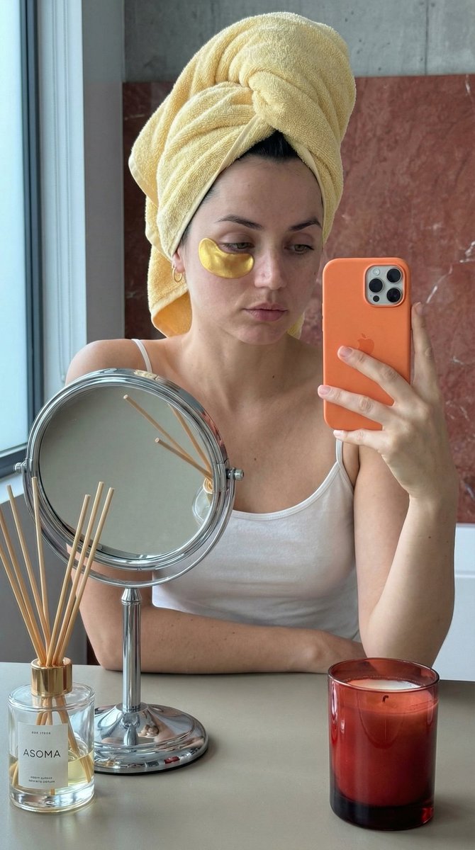Ana de Armas mirror selfie in a Scandinavian bathroom