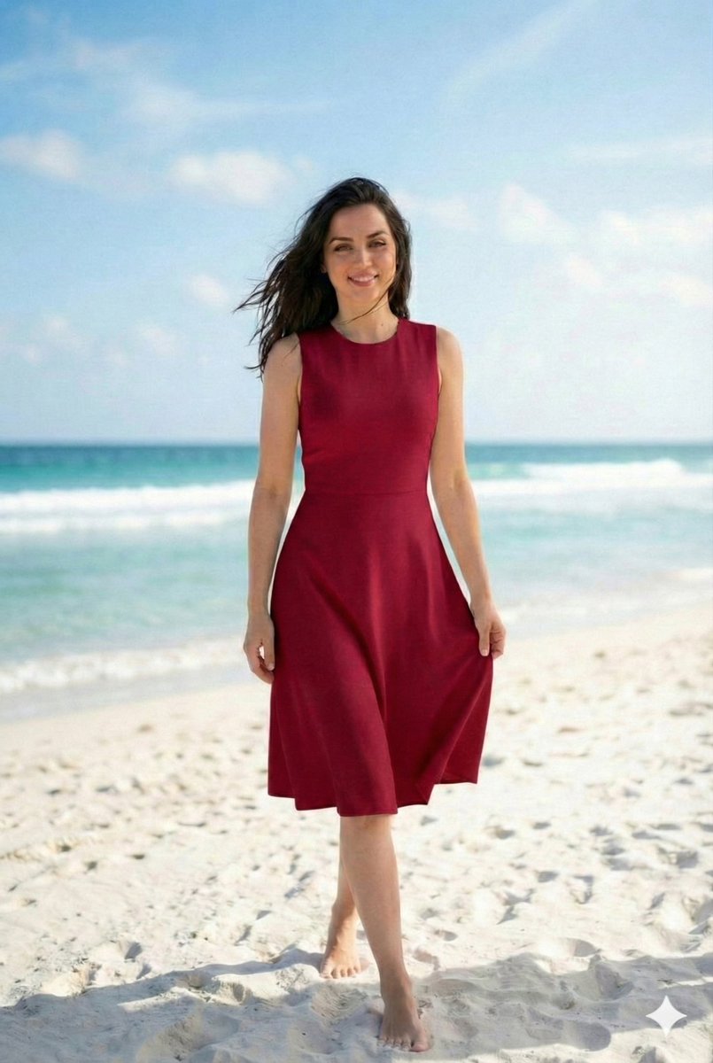 Prompt; "Outdoor beach photoshoot on a perfect sunny day, girl same as reference, standing gracefully on the sand, wearing an elegant sleeveless dress