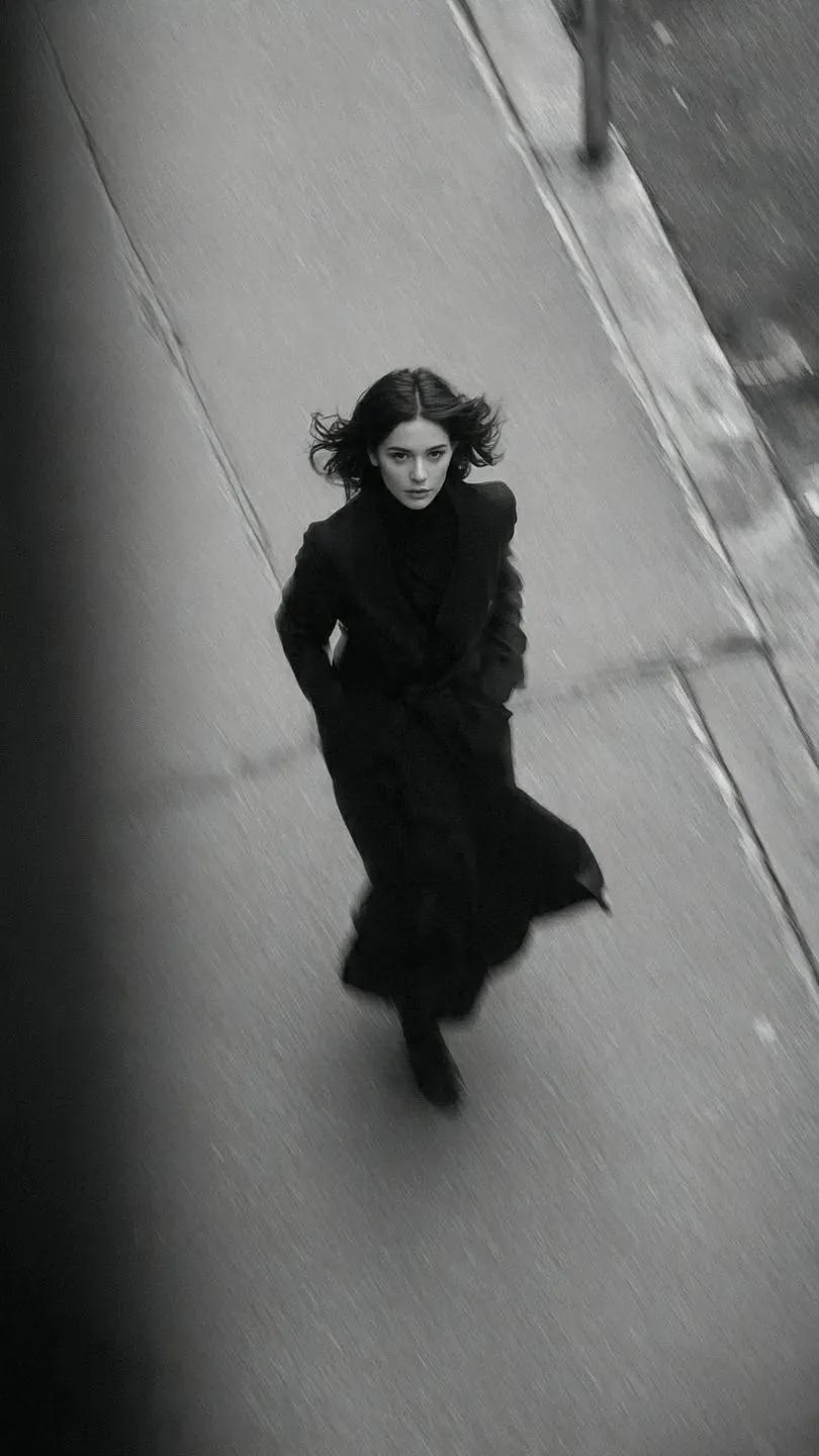 black and white photograph of a vogue fashion shoot. a 20-year-old woman with dark hair walking alone down the street, wearing a black coat. strong se
