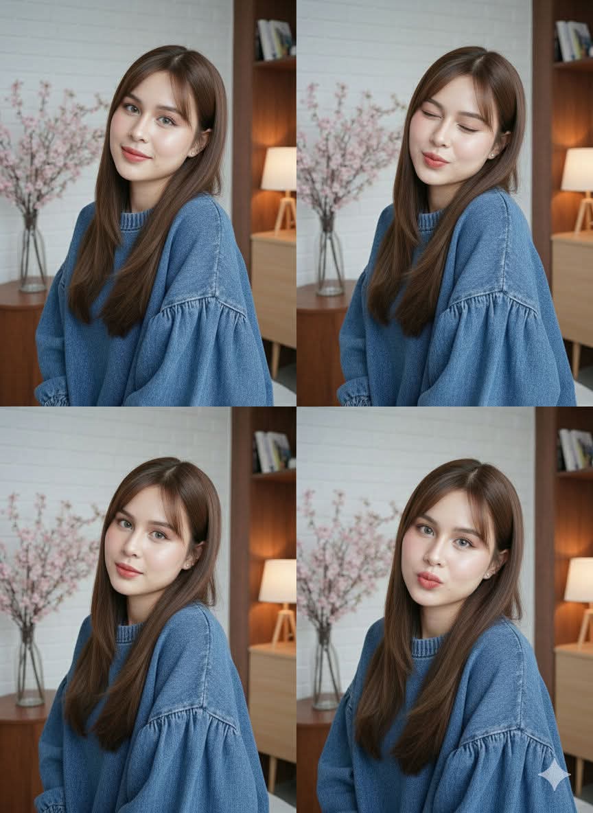 Edit photos without changing faces. Create a 4-photo collage of a beautiful young woman with bright, glowing skin, long, straight brown hair, nude red