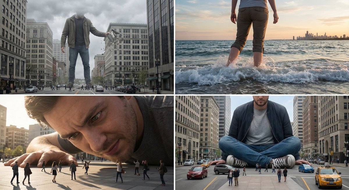 Create me as a giant version (50 feet tall) towering over a city or landscape: VERSION 1: I'm standing in downtown area, my head touches clouds, regul