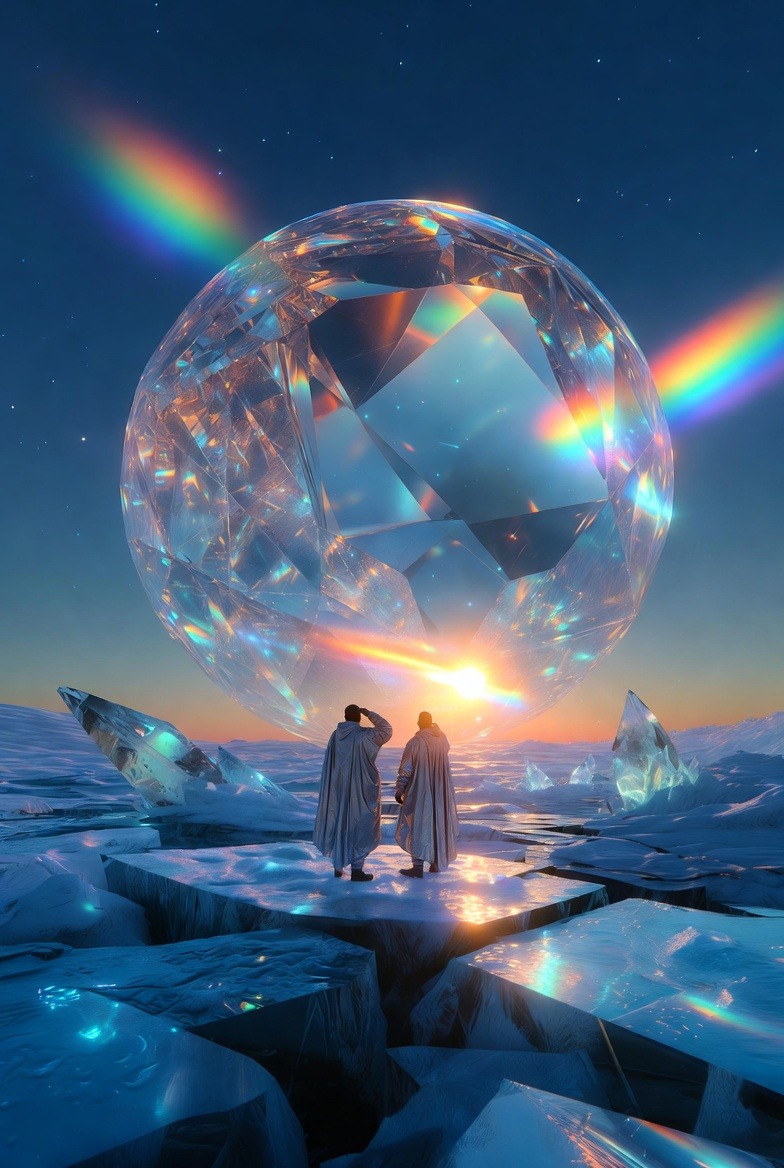 "scene_description": "Two figures stand atop a crumbling ancient monolith, overlooking a flooded city of massive brutalist