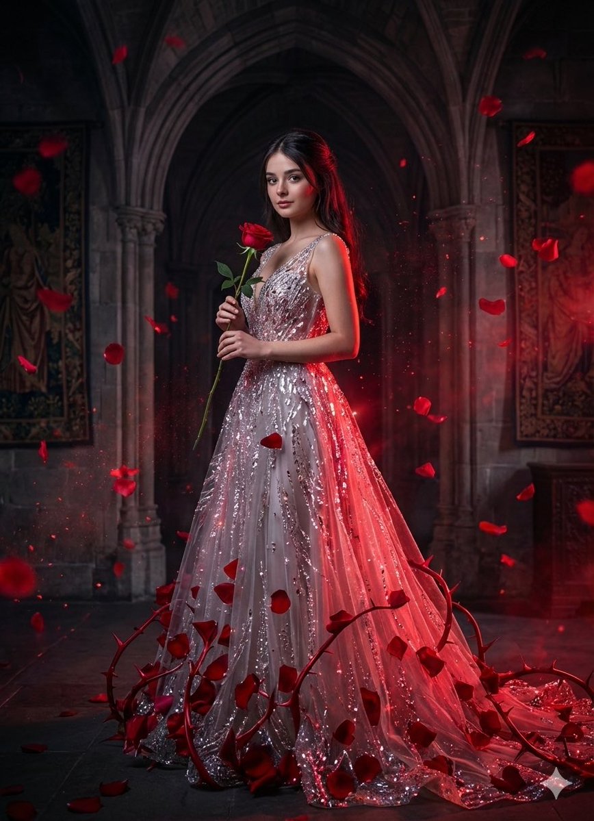 High-Fashion Fantasy Editorial with Rose and Crystal GownSplit-Reality Portrait: Photorealistic vs Illustrated